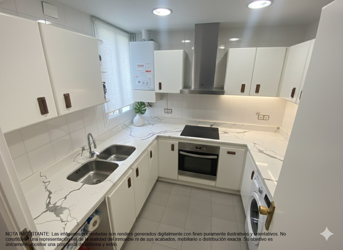 NOTA IMPORTANTE: Algunas imágenes presentadas son renders generados digitalmente con fines puramente ilustrativos y orientativos. No constituyen una representación fiel de la realidad del inmueble ni de sus acabados, mobiliario o distribución exacta. Su objetivo es únicamente mostrar una propuesta de reforma y estilo.